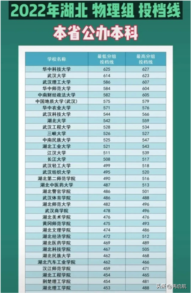 2022年,湖北省内本科批投档线分数线公布后,首选物理类专业组,省内高校分数由高到低排名重新排序,一起来看看各高校的表现情况。