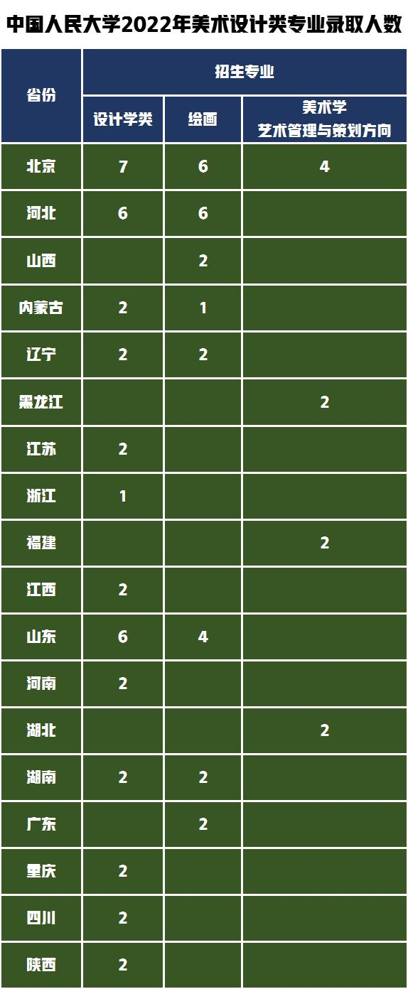 美术设计类专业2022年招生录取75人,包括设计学类绘画、设计学类、美术学(艺术管理与策划方向)3个方向,学校不组织校考,按各省美术统考成绩作为录取依据,采取分省分专业录取,具体录取省份及录取人数见下表: