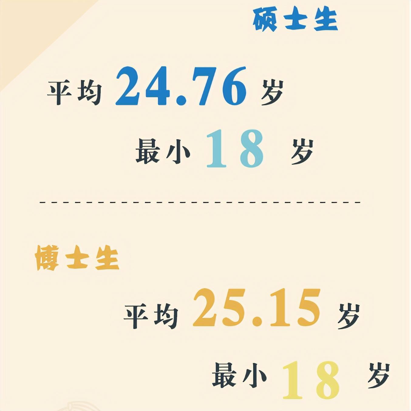硕士研究生平均入学年龄24.76岁,博士研究生平均入学年龄25.15岁,最小入学年龄18岁,00后出进入研究生阶段学习已成为主力,最小出的2004年,可以说年轻真好,青年才俊,未来祖国之栋梁。