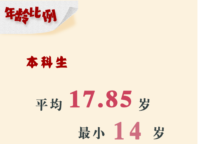 本科生平均入学年龄17.85岁、最小年龄14岁。00后出生所占绝大多数,其中2004年出生的最多, 最小的学生2007年出生。