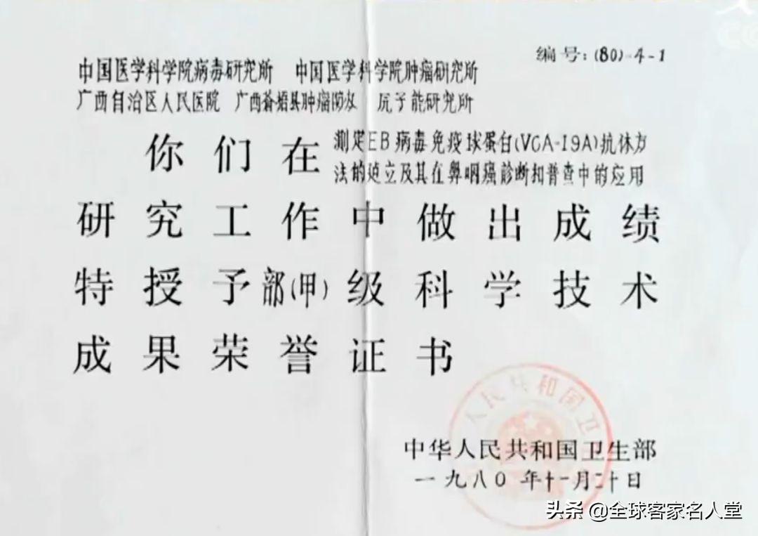他还携手自治区人民医院、苍梧县鼻咽癌防治所和梧州红十字会医院肿瘤研究所,在广西建立了国际上第一个鼻咽癌防治研究现场,在苍梧县建立了国际上第一个鼻咽癌现场研究基地。