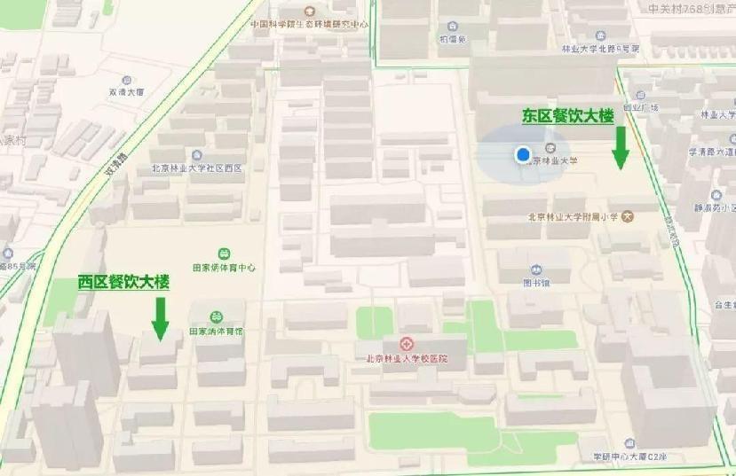 北林共有东、西两个食宿圈,东区食堂邻近11、12、13号公寓楼,西区食堂则邻近7、10号公寓楼和田家炳体育场。