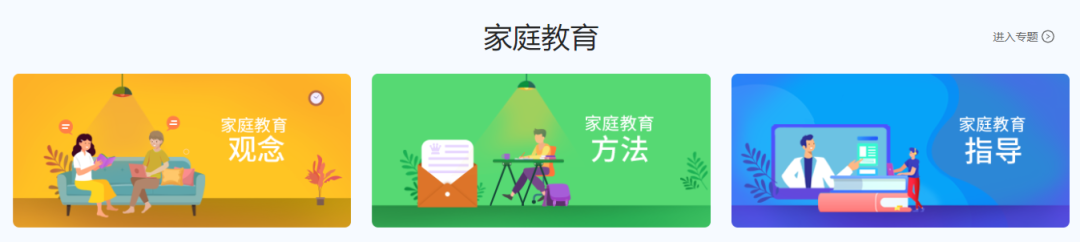 家庭教育资源包括家庭教育观念、家庭教育方法和家庭教育指导等3类资源。家长可以在这个版块学习家庭教育有关的知识。