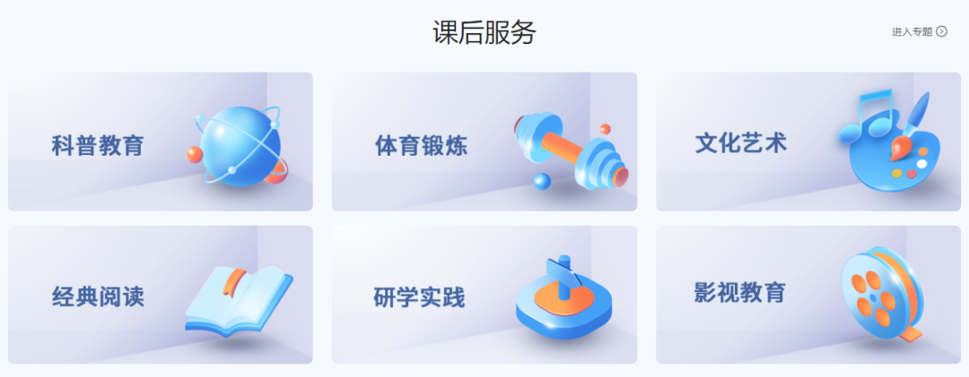 课后服务资源包括科普教育、体育锻炼、文化艺术、经典阅读、研学实践、影视教育等6类资源。