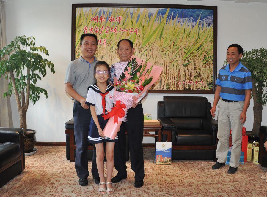 2016年7月20日,育红小学师生代表在长沙袁隆平工作室和袁老合影。