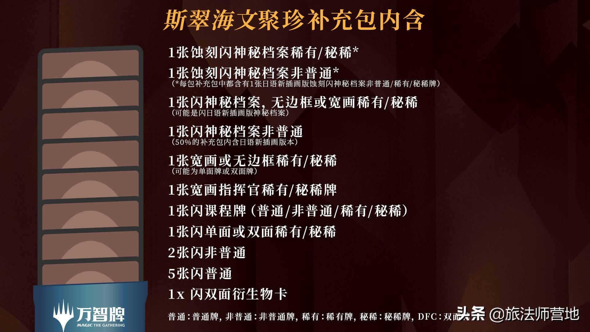 1 张传统闪卡的双面衍生物 – 聚珍补充包里有 7 种不同会被主系列牌所派出的衍生物,以及两种不同的徽记。每张衍生物和徽记都能在这些双面闪卡中的其中一面找到。如果你想收集传统闪卡的衍生物卡和徽记,聚珍补充包是斯翠海文产品中唯一可以开到的地方。