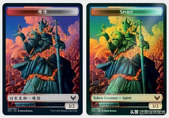 每个学院都有自己咒语可以派出的衍生物。举例来说,衡鉴学院会派出 3/2 的精怪衍生生物,而在聚珍补充包里你可以开到闪的衍生物卡。那张衍生物长得会像是这样: