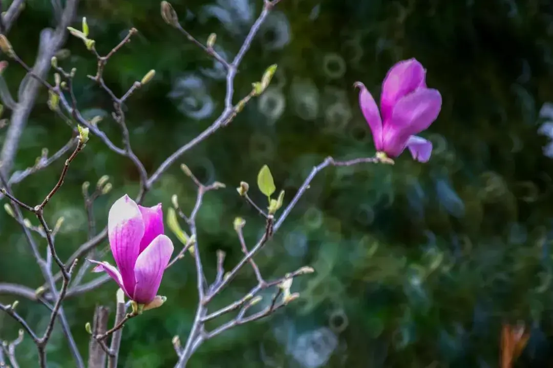图书馆旁的玉兰花也如优雅的仙子俏立枝头,白的纤尘不染,紫的神秘婉约。