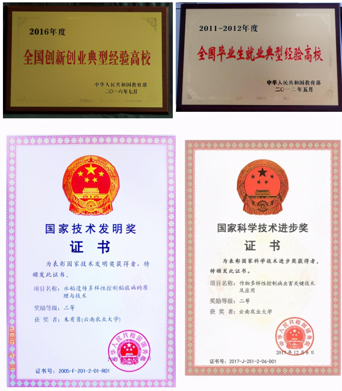 农大获联合国粮农组织(FAO)科学研究一等奖、国际农业研究(CGIAR)杰出科学奖、国家技术发明二等奖、何梁何利科学技术进步奖、云南省科技进步特等奖等国际、国家及省部级奖励370余项。