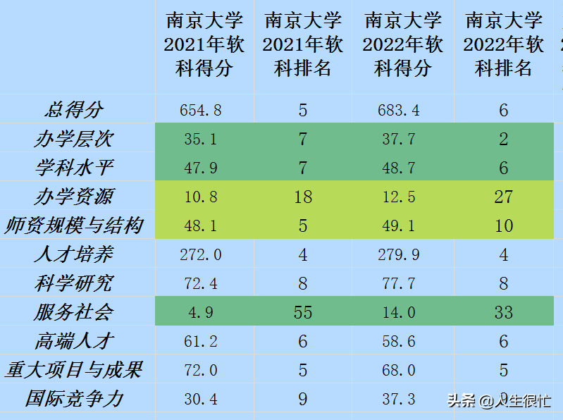 从上图可以看出:十大评价指标排名中,在学科水平(变化1名,忽略)、人才培养(变化1名)、科学研究、高端人才、重大项目与成果、国际竞争力六项指标排名中,几乎没有变化。