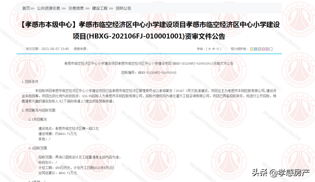 位于孝感市临空经济区横一路以北,合同估算价为4800.71万元,计划工期450日历天,计划开工日期2021年8月1日。