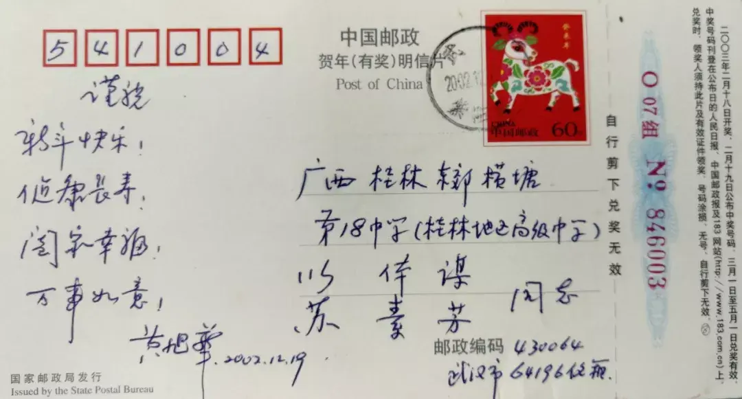 由于当时的通讯不便,以体谋与黄旭华上大学后就失去了联系。直到上世纪80年代末,以体谋在桂林地区高中执教期间在全国各地发表了很多文章,黄旭华从刊物上找到地址,给他写了来信。两个阔别多年的老同学终于有了书信往来,逢年过节还互寄明信片问候。2005年,两人都被邀请出席了桂林中学百年校庆,终于再次见面。