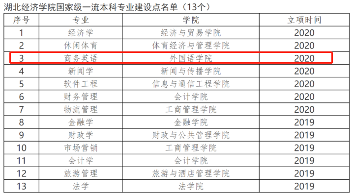 教育部公布2020年度国家级和省级一流本科专业建设点名单,湖北经济学院商务英语获批国家级一流本科专业建设点。