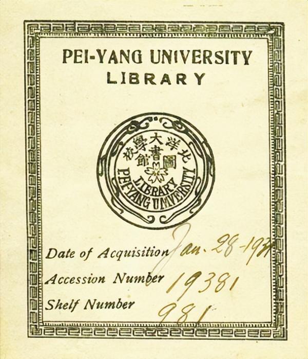 北洋大学校时期的图书馆藏书票 印有“PEI-YANG UNIVERSITY”字样