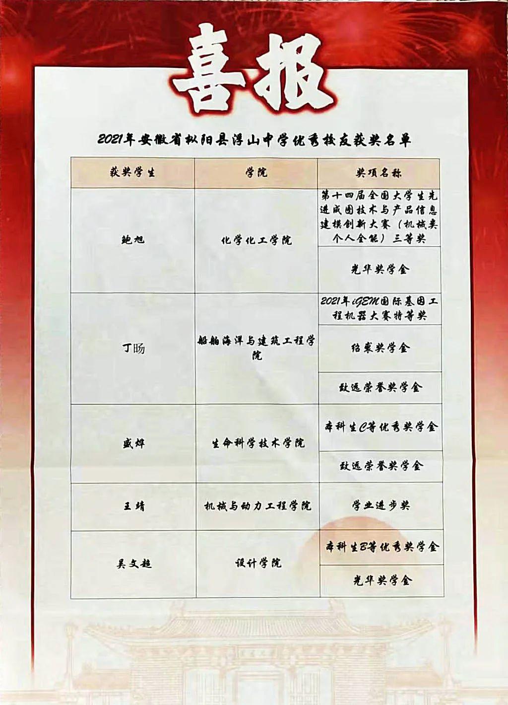 枞阳浮山中学毕业生鲍旭等10位同学在上海交通大学表现突出,获得了多项奖励和各项赛事殊荣,为众学子树立了良好榜样!
