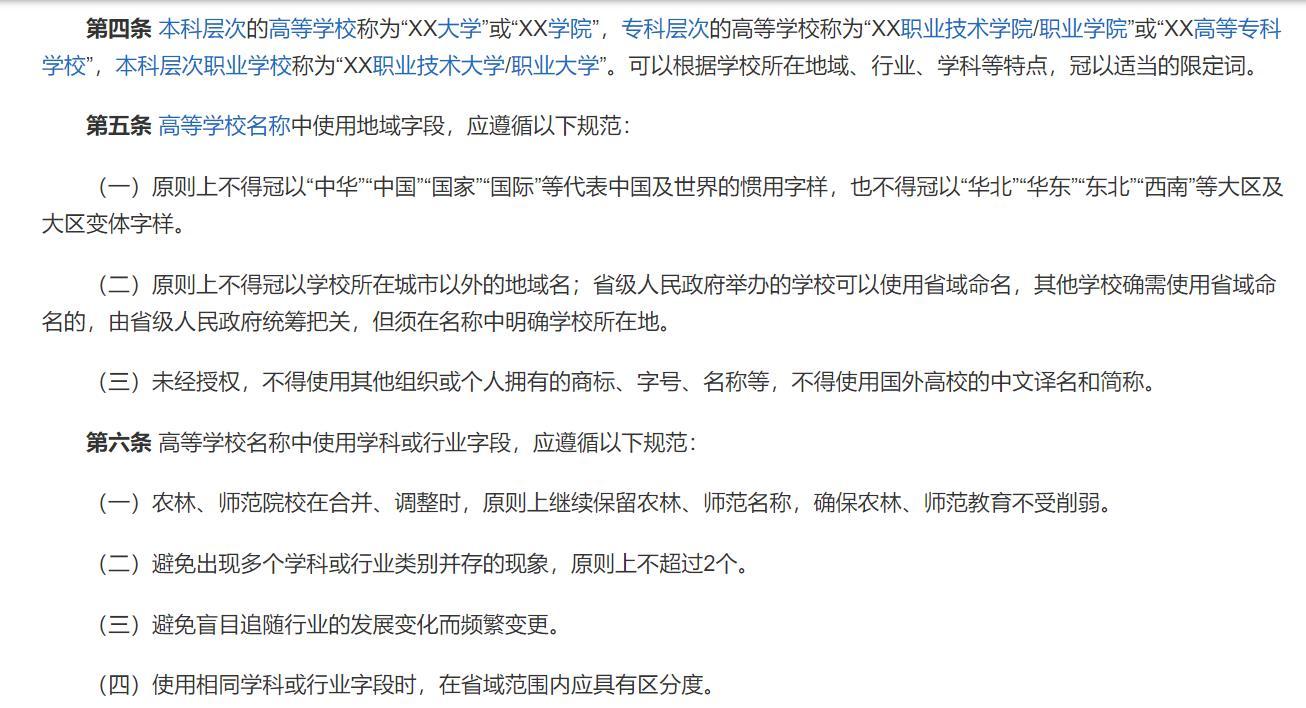 为规范高校名称的使用,教育部于2020年8月20日印发《高等学校命名暂行办法》(教发厅〔2020〕6号)。《暂行办法》对高等学校名称中使用地域字段、学科或行业字段、英文译名等提出明确规范。不得冠以代表中国及世界的惯用字样和大区及大区变体字样;不得冠以学校所在城市以外的地域名;省级人民政府举办的学校可以使用省域命名,其他学校确需使用省域命名的,由省级人民政府统筹把关,但须在名称中明确学校所在地。《暂行办法》在踩住高校更名的刹车的同时,也进一步规范了高校名称的命名。