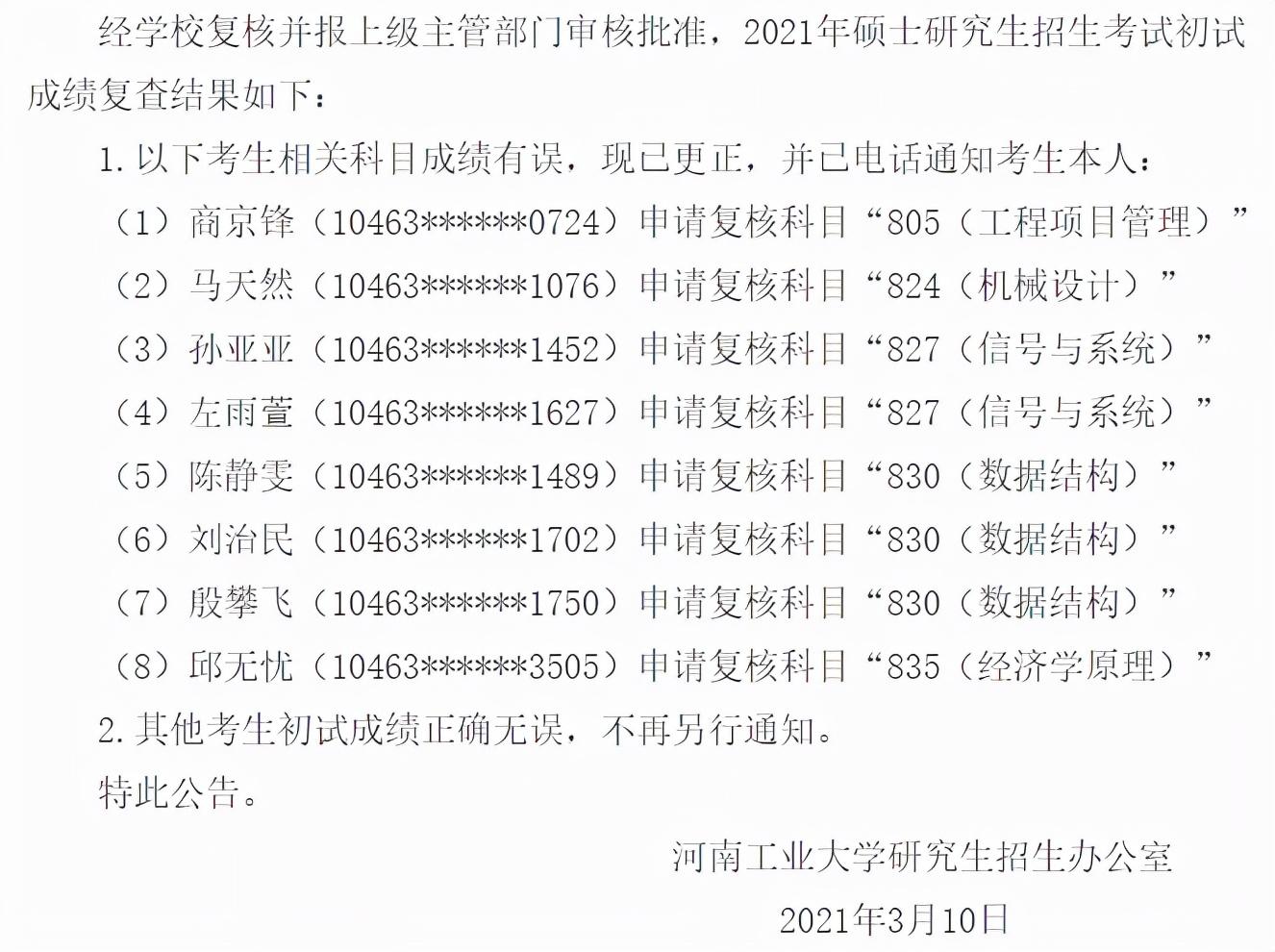 比如,2021年河北工业大学就有8位考生的成绩在“复核”后确定存在问题,并且进行了更正。