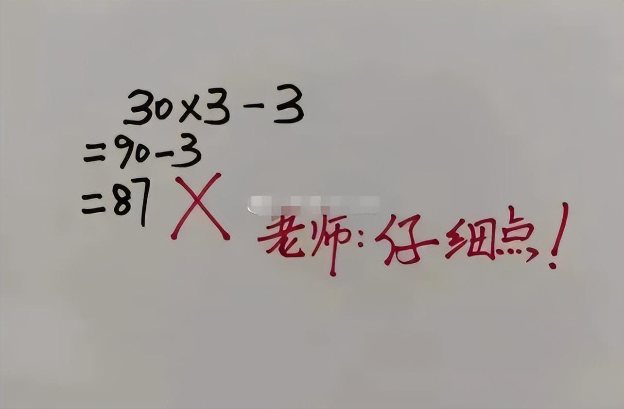 当大家看到这道数学题的时候,本能的反应就是先算乘法再算减法,这也是算术过程中的股则所在,而当大家仔细去看这道题的时候,“30*3-3”,明显答案就是87,也就是“90-3”,这名小学生还将步骤写了上去,但是却依旧被老师判叉。
