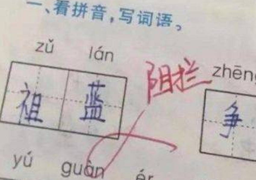 就像是这道题,题目中给出的是“阻拦”的拼音,但是大家都知道,也有“祖蓝”的存在,所以有人认为,并没有规定一定要写哪个,所以觉得小学生的回答并没有错,但终究老师是不会容忍的,直接判叉,并写上了“正确答案”。