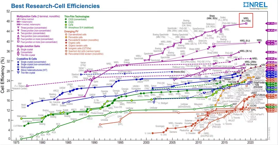 47.1%[17](集中光照条件下,同一设计的变体在1倍太阳光照条件下为39.2%),是当前性能较好的量产太阳能电池组的两倍以上(隆基股份P型PERC电池量产转换效率超过23%[18]),十分惊人。