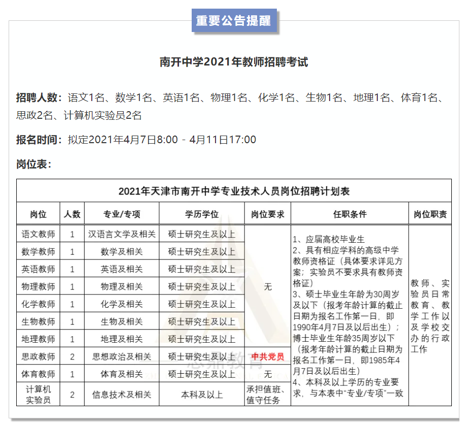学历要求:除计算机实验员要求本科及以上学历外,其它岗位均要求考生需研究生及以上学历
