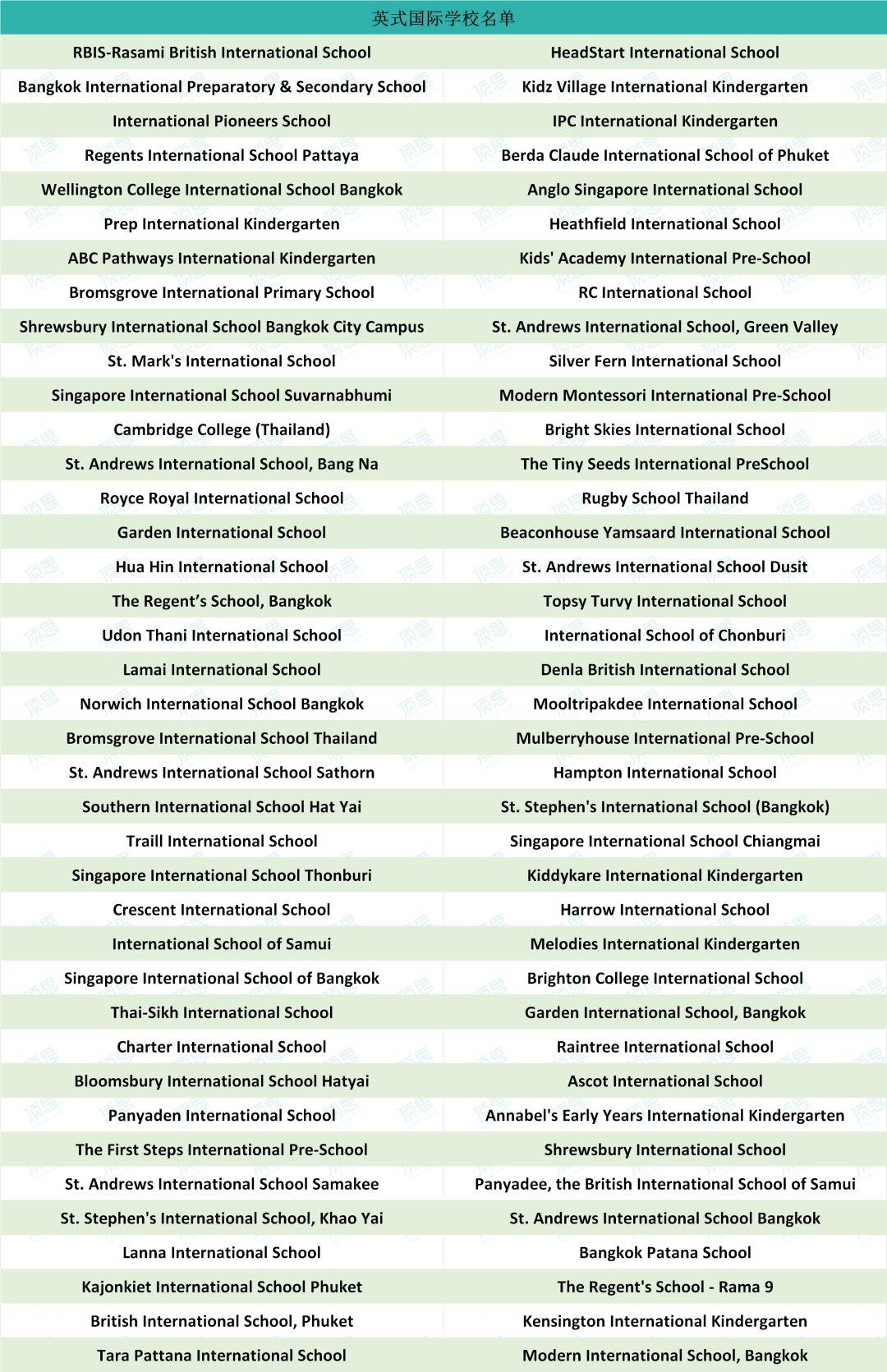 除了两所公学的国际学校外,在实行英国课程的国际学校中,泰国Bangkok Patana School学校也广受青睐。在泰语中,Patana的意思是“发展”。