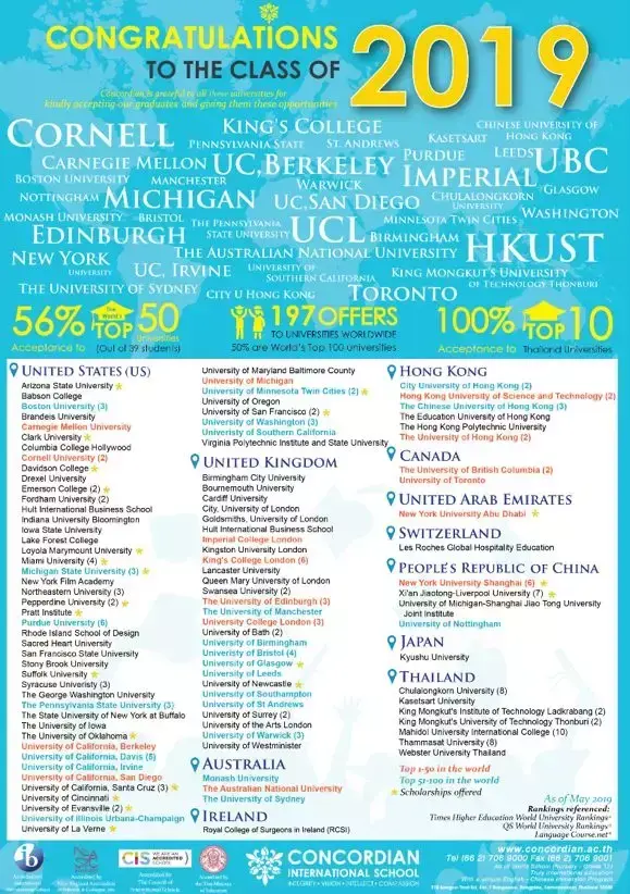 2019届毕业生中,有56%的学生考入了世界50%的学校(共39名学生),50%的学生拿到世界前100名学校的offer。包括康奈尔大学(2人)、宾夕法尼亚大学(3人)、爱丁堡大学(3人)和香港大学(2人)等。