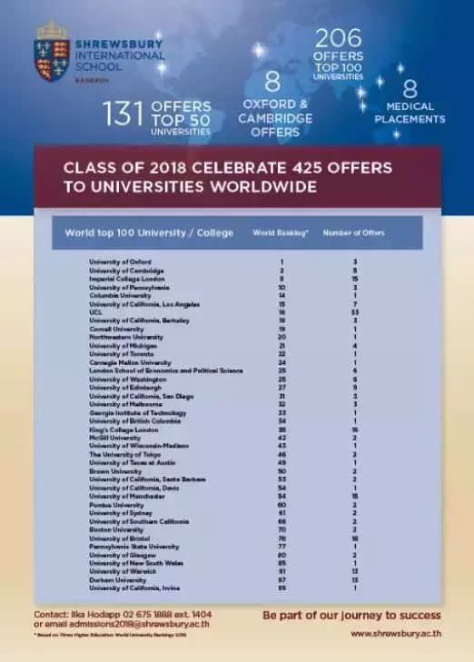 在2018年IGCSE考试中,什鲁斯伯里国际学校有69%的学生获得A*和A的成绩,在A Level考试中,70%的学生获得A*或A。收到的offer不乏牛津大学(3名)、剑桥大学(5名)、哥伦比亚大学(2名)、康奈尔大学(1名)等世界顶尖级大学。