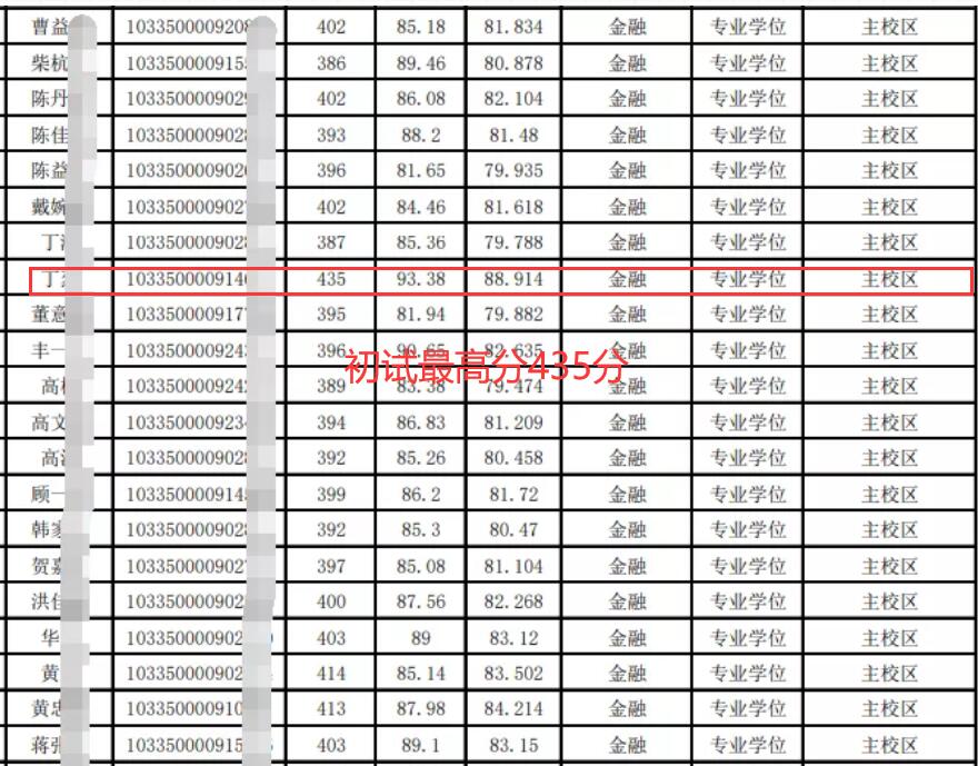 下图为浙江大学金融专硕2020年拟录取名单,进入复试139人,拟录取102人;初试最高分435分,最低分371分,平均分393分,复录比1.4:1,由于扩招刷人的情况有所降低。