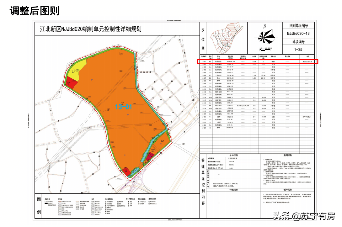 江北新区NJJBd020单元控详13规划管理单元13-01地块容积率由0.55调整为0.58,其他指标保持不变。