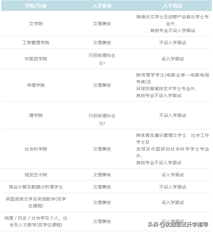 Q2:各学院的入学要求和录取标准是什么?哪些专业2021年需要参加入学面试?