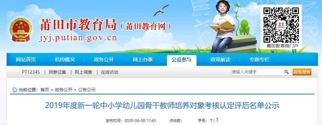 根据《关于做好新一轮莆田市中小学幼儿园骨干教师培养对象考核认定工作的通知》(莆教人〔2019〕53号)精神和要求,经个人申报,所在各县区、学校初审、评前公示后,于2020年6月7日组织专家进行考核认定评审,拟对陈素林等229人新一轮中小学幼儿园骨干教师培养对象予以评后公示。公示时间自2020年6月8日起至2020年6月14日止。如有异议,请在公示期间向莆田市教育局人事与师资管理科反映,邮箱:ptsjyjrsk@163.com,电话:2684682。