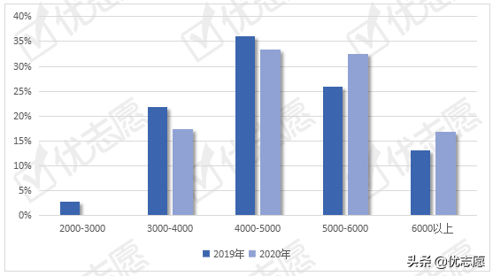 下图展示了2019-2020年广西大学本科毕业生的薪资分布,与2019年相比,2020年薪资整体上升。虽然广西大学毕业生受疫情影响就业率较上一年度有所下降,但是薪资逆势增长。