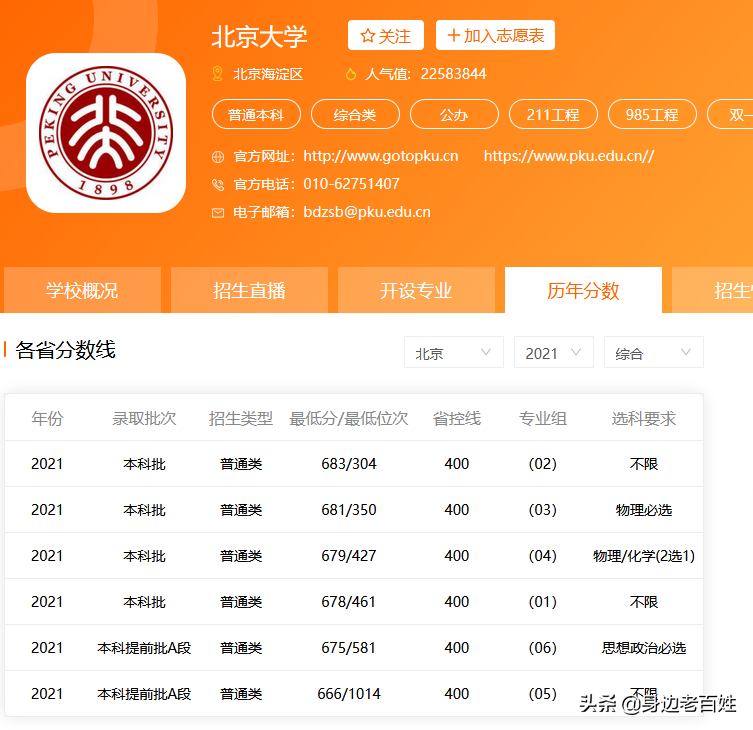 今年北京市普通本科控制线为425分,根据最近两年的录取形势,那么2022年北京大学在北京地区的录取分数至少也要在680分以上!因此,那些说北京户口400多分就能上北大的谣言不攻自破。