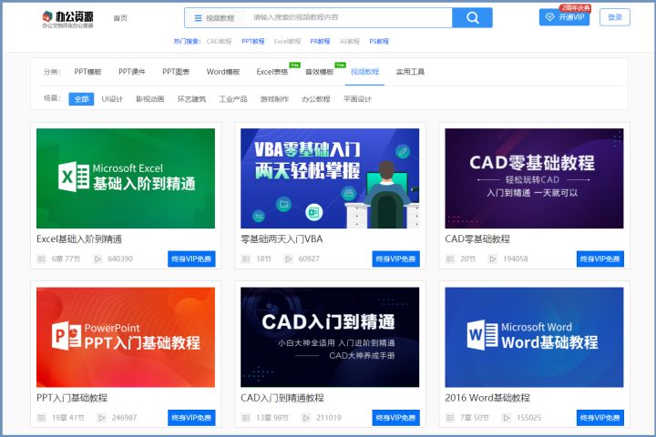 点击【视频教程】就可以看到它还隐藏着一些办公软件、UI设计、影视动画、平面设计视频教程,每一个课程都按照入门到精通进行了细致的划分,适合我们用来学习。