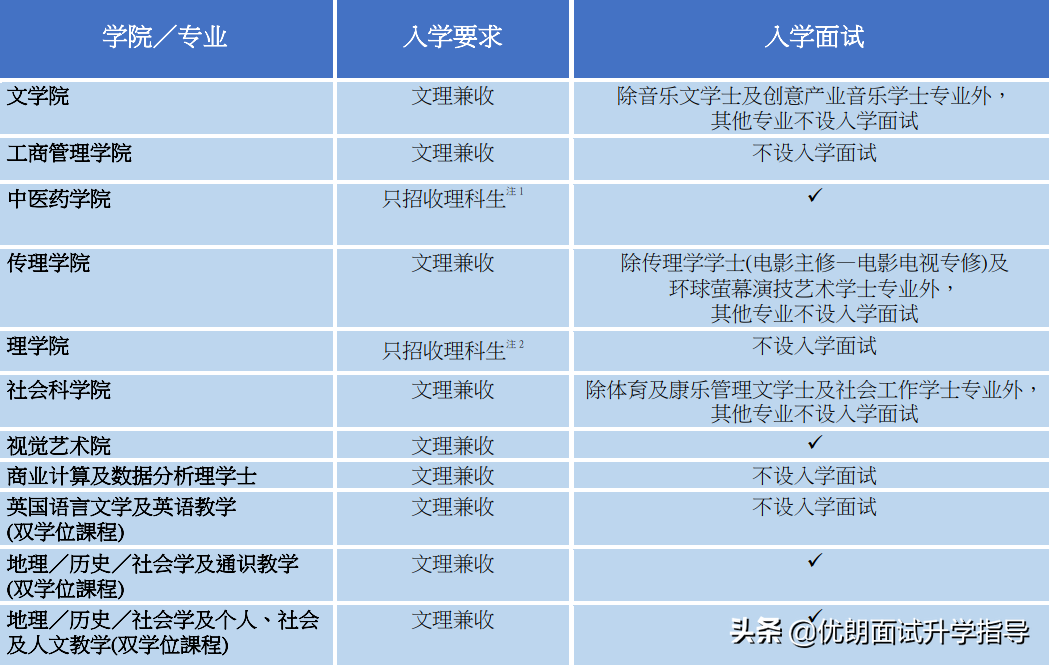 各学院/专业均以国家统一高考成绩为录取标准,个别专业另设入学面试作综合评估,择优录取(请点击大图查看):