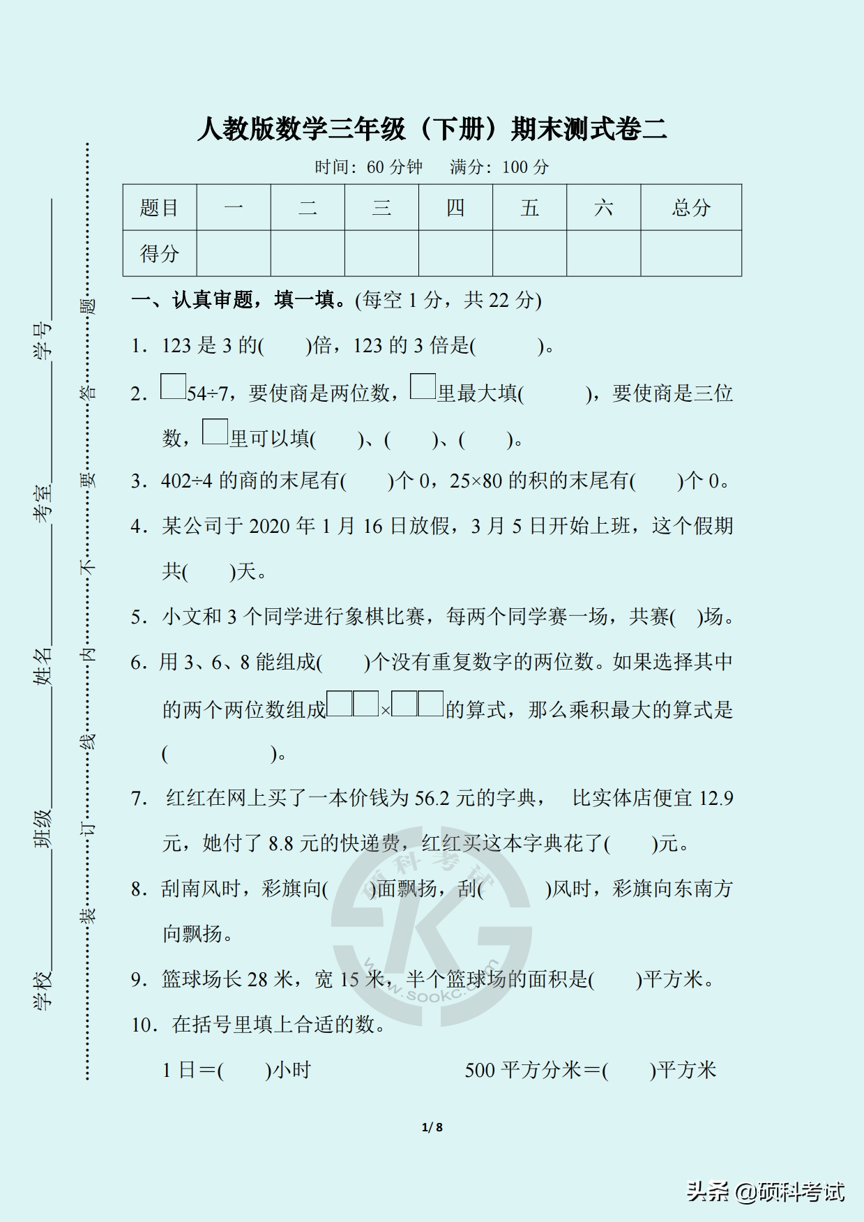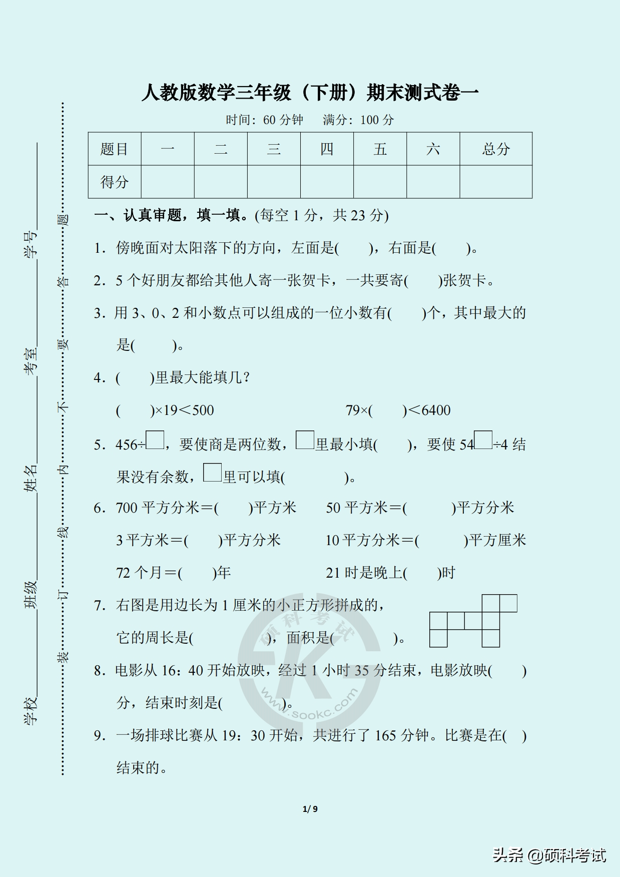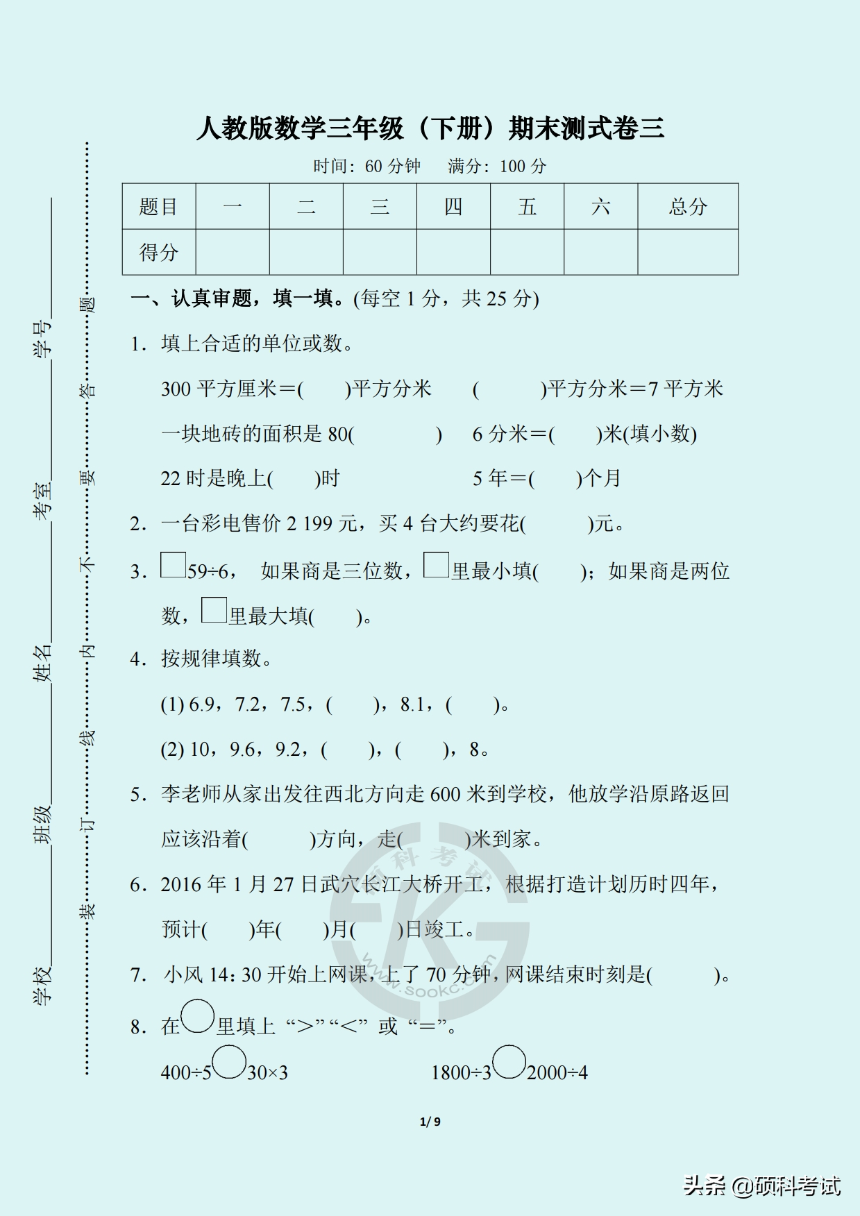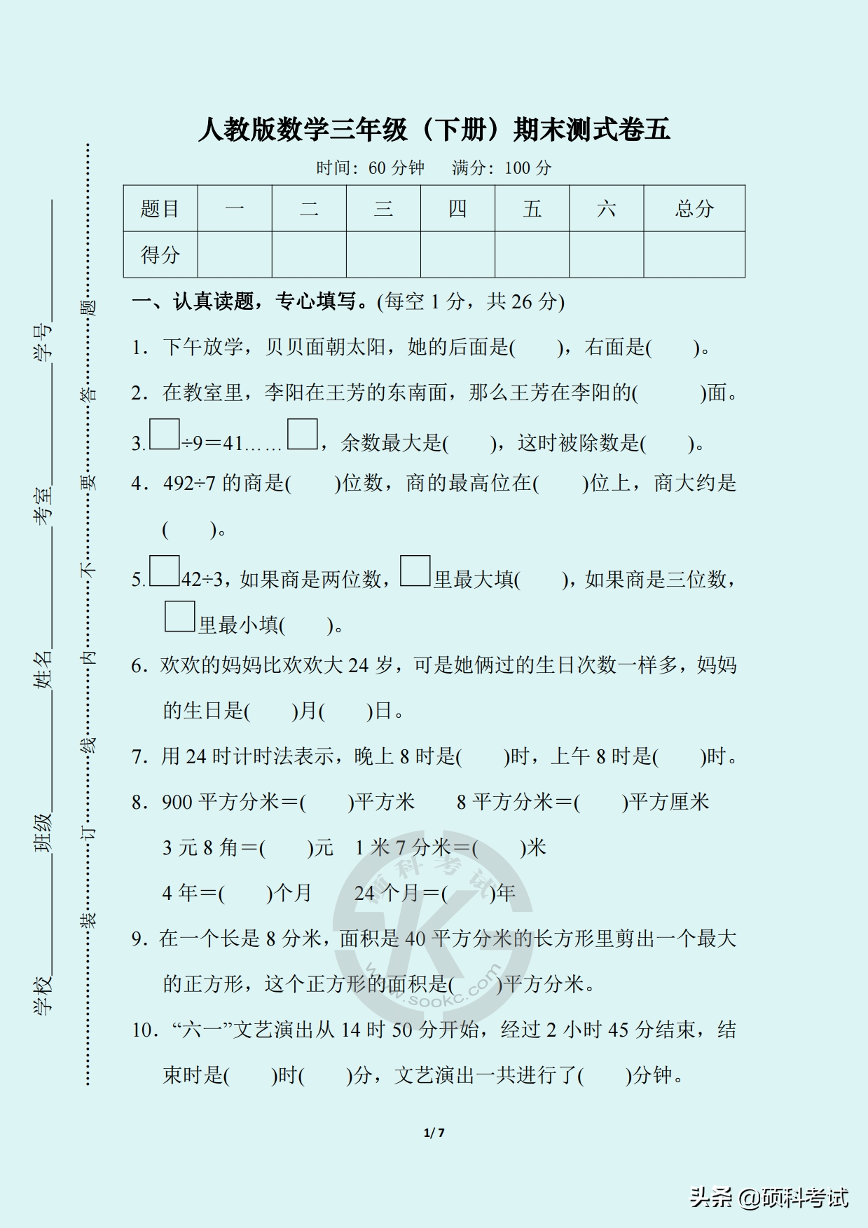 人教版三年级下册数学期末模拟卷五套,主要包括:填空、判断、选择、计算、动手题及聪明题,需要空白卷的可@硕科考试主页查看,有三年级生的家长可以给孩子考前复习,巩固基础,查缺补漏,争取期末拿满分!