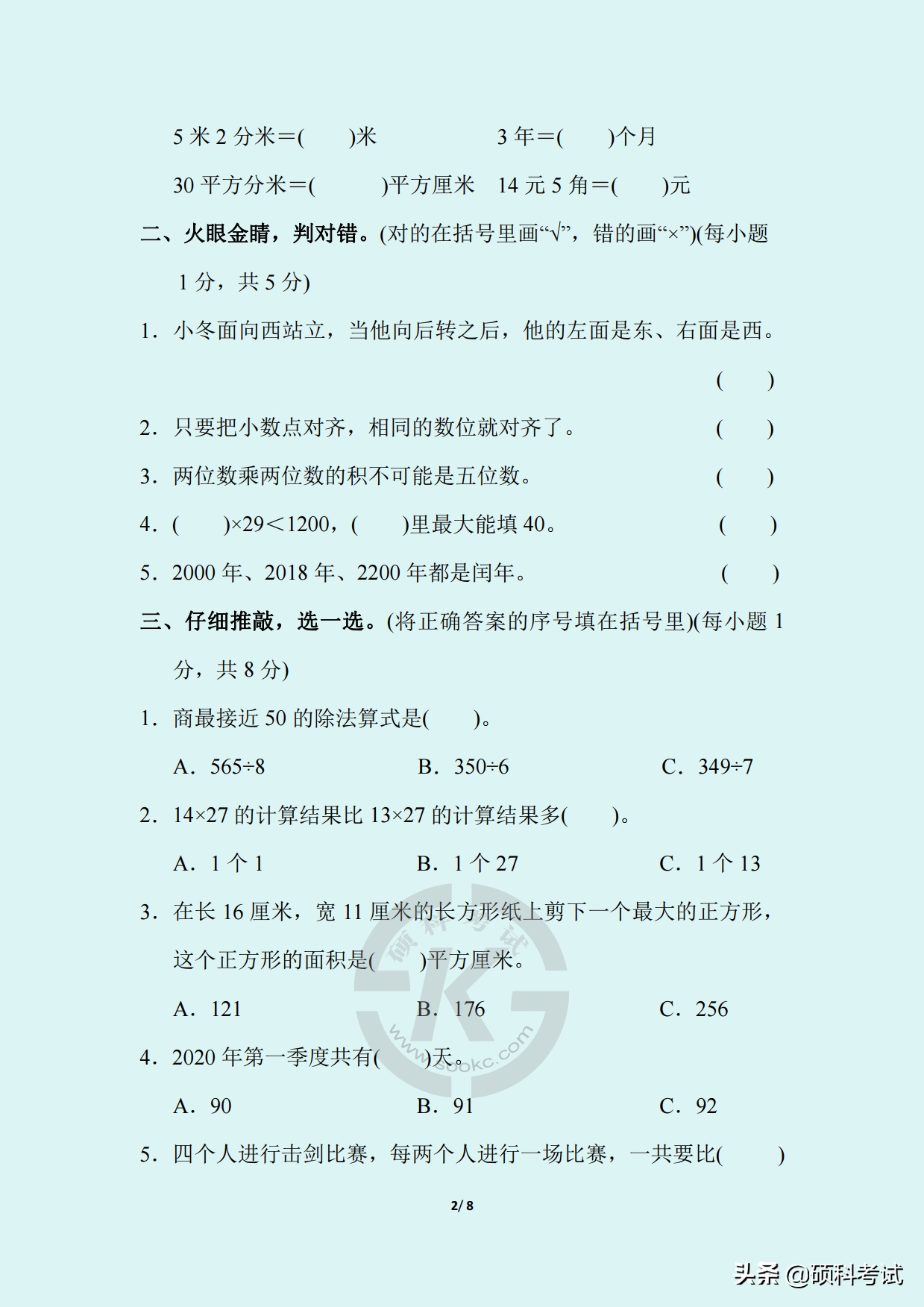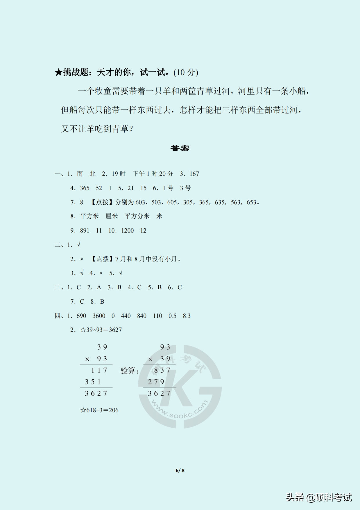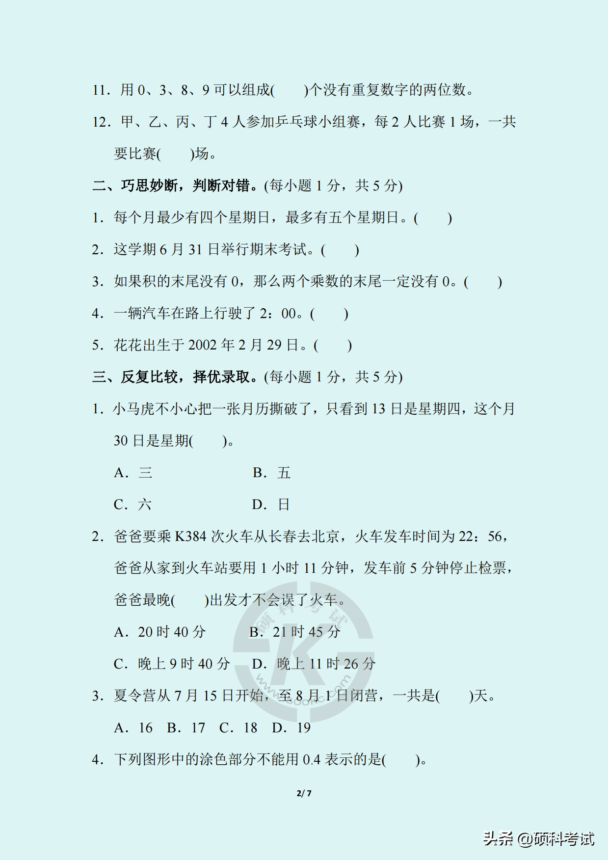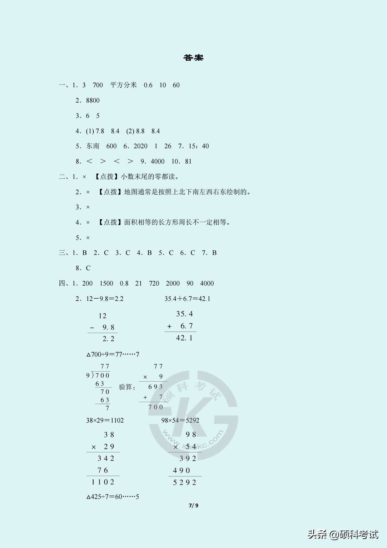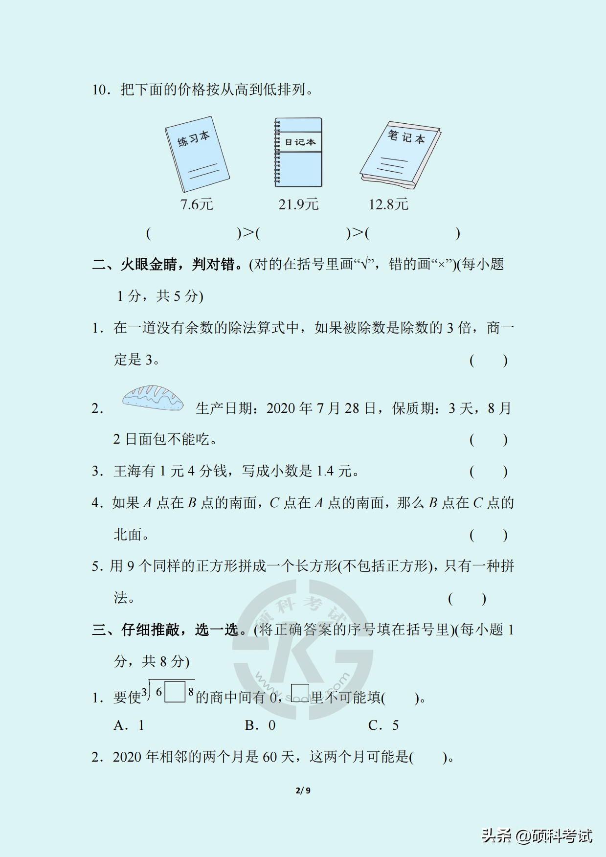 人教版三年级下册数学期末模拟卷五套,主要包括:填空、判断、选择、计算、动手题及聪明题,需要空白卷的可@硕科考试主页查看,有三年级生的家长可以给孩子考前复习,巩固基础,查缺补漏,争取期末拿满分!