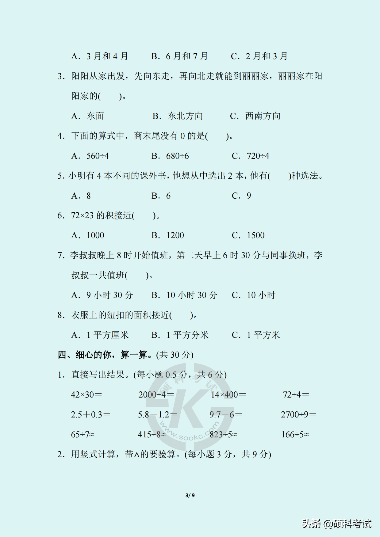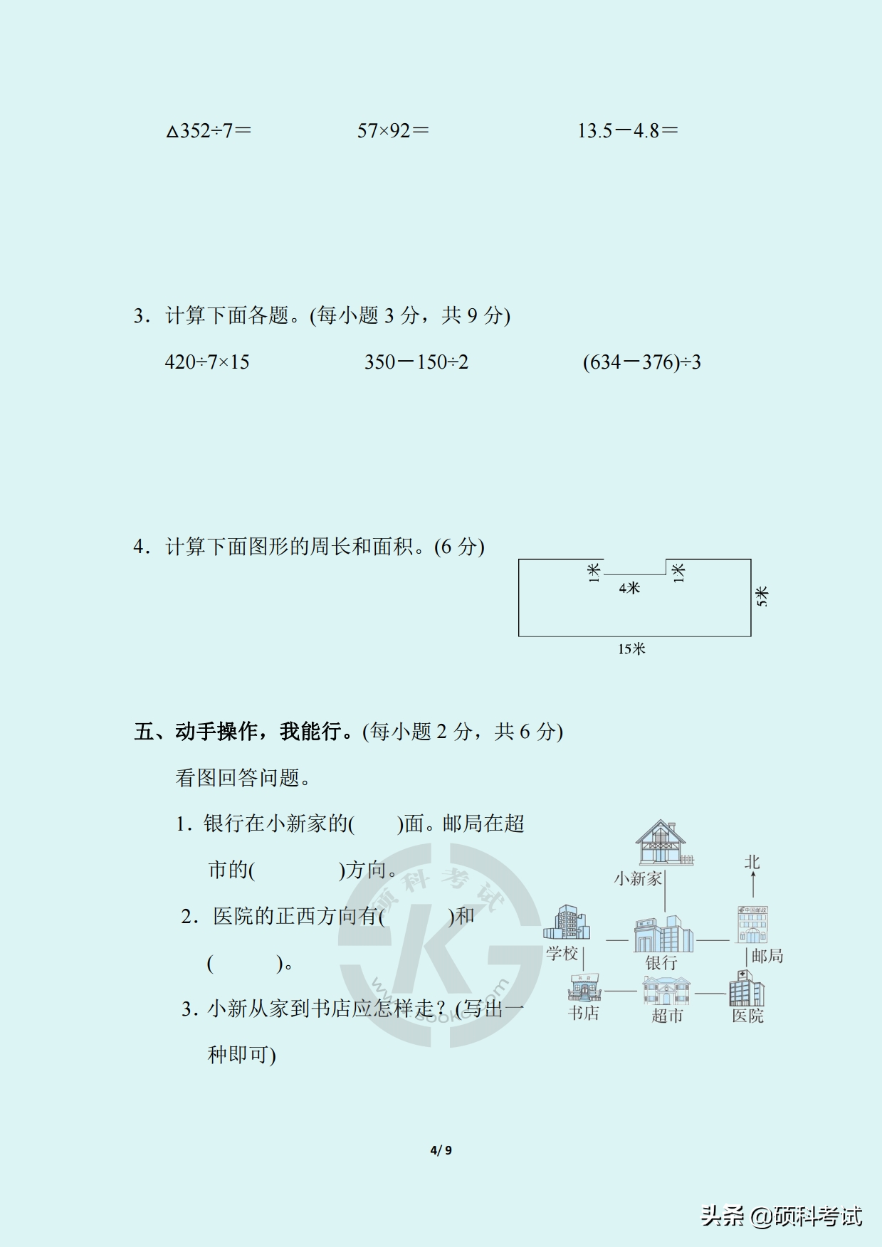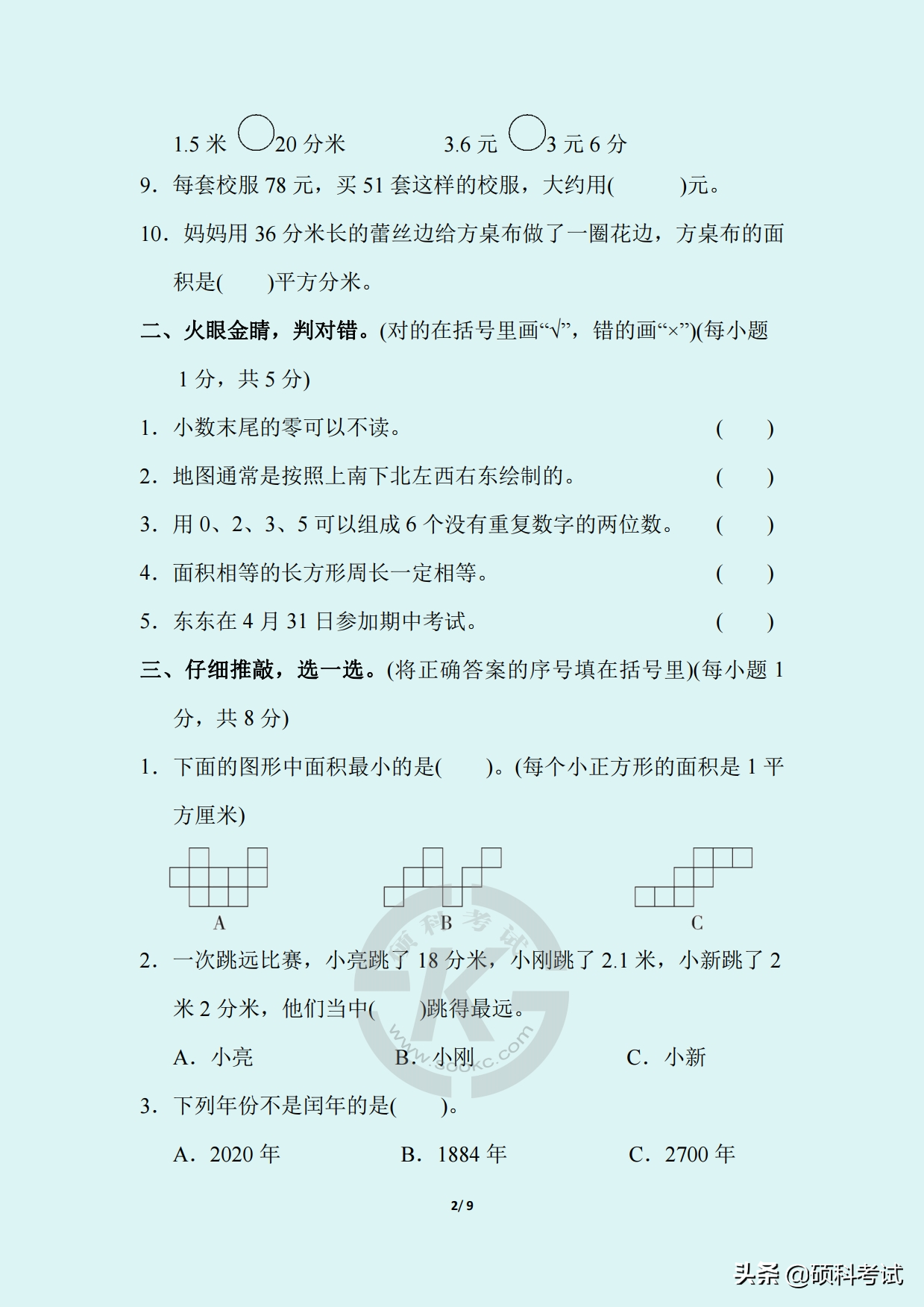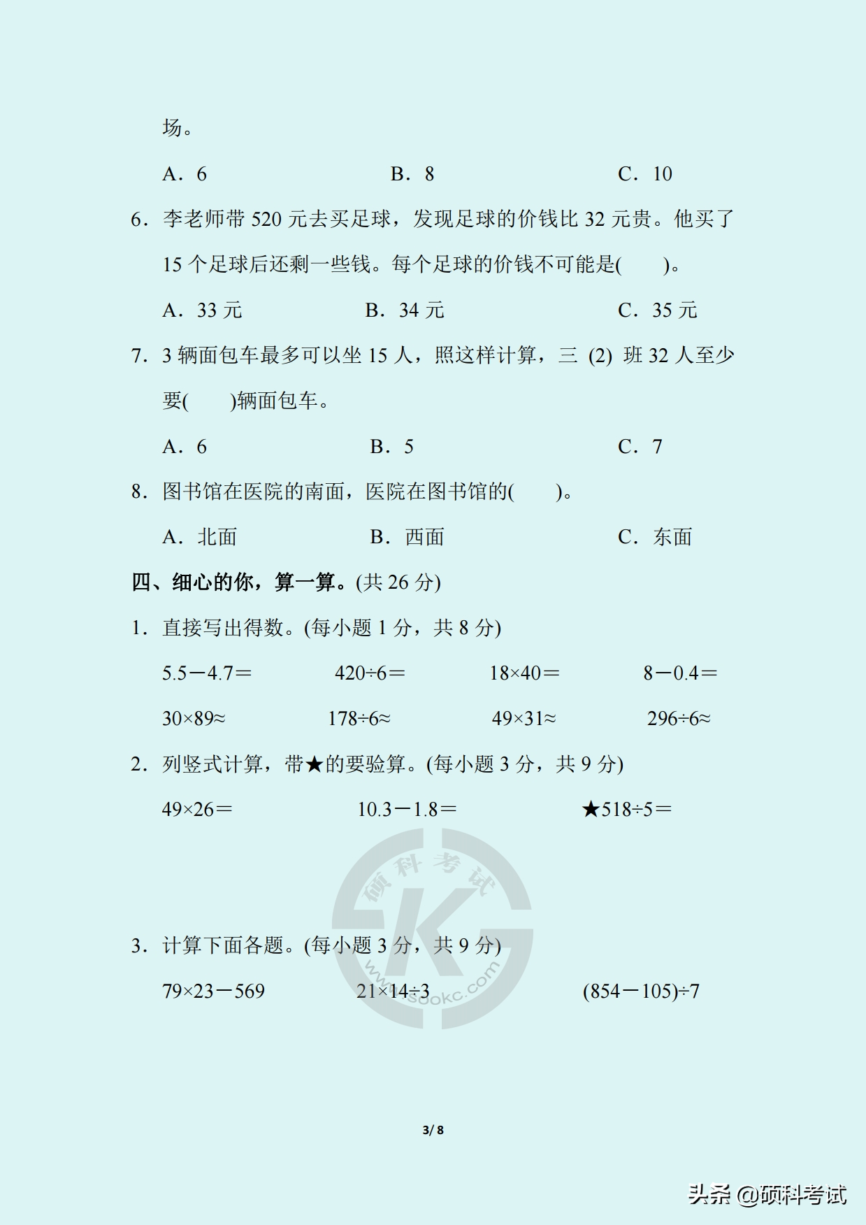 人教版三年级下册数学期末模拟卷五套,主要包括:填空、判断、选择、计算、动手题及聪明题,需要空白卷的可@硕科考试主页查看,有三年级生的家长可以给孩子考前复习,巩固基础,查缺补漏,争取期末拿满分!
