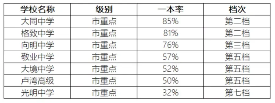 如果区内高中对比,同样是市重点高中,大同和格致的一本率可以达到80%以上,而光明的一本率只有30%+,甚至不如外区的一些区重点。