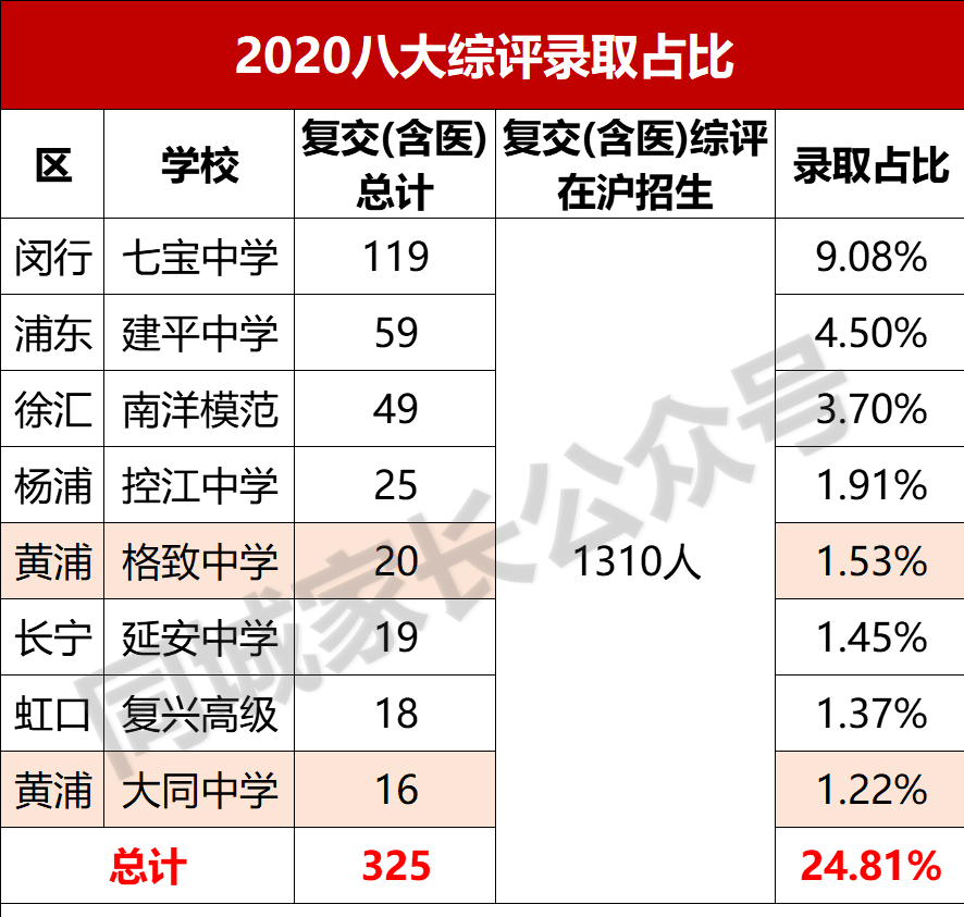 2020年,格致中学的复交综评录取率为1.52%,大同中学为1.22%。