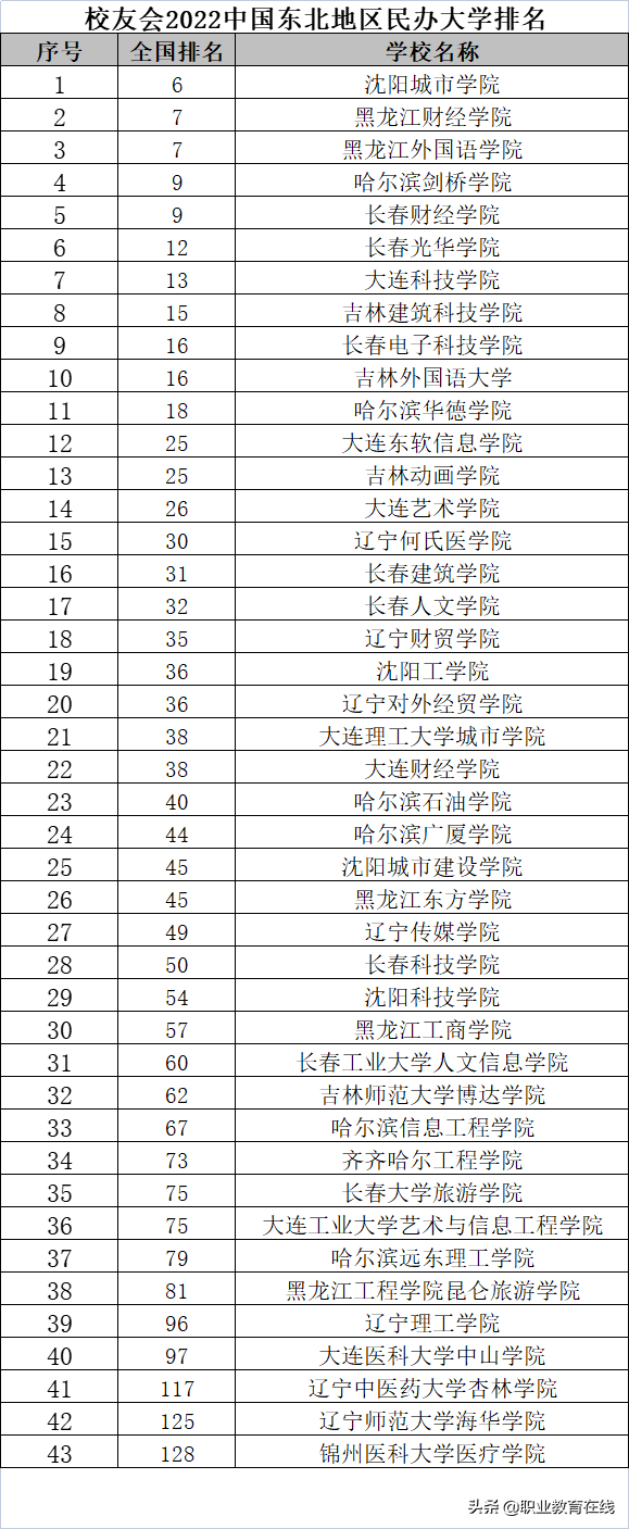 根据高等院校名单,东北地区民办普通本科院校共46所,其中,沈阳工业大学工程学院和沈阳航空航天大学北方科技学院2所独立学院已经实质上停止招生,只是在名单上还保留着,自然不会参与排名。辽宁理工职业大学作为民办本科层次职业大学,没有在这个排名中,东北地区有43所民办大学参与了排名。