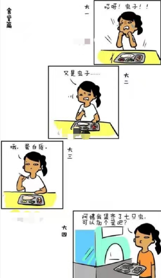而大学食堂的饭菜偶尔也会有奇怪的东西,不过学校食堂的东西是最干净的。但是对于刚进入大学生活的学生而言,女生刚开始在食堂吃饭会矫情一些。但是随着时间的转移,等到大四的时候,他们已经习惯了。