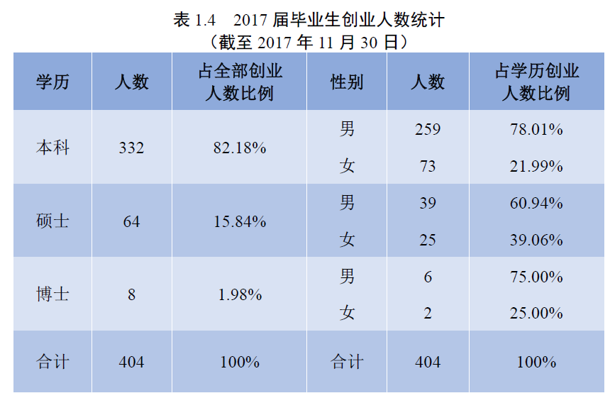 2017届毕业生参与创业共 404人。从学历分布来看,本科和硕 士仍是创业主要群体,占比超过 士仍是创业主要群体,占比超过 90%。从行业分布来看超过 70%的创业项目集中在信息产、文体娱乐批发零售教育和制造业。这一比例高过了所有C9高校大学生创业比例