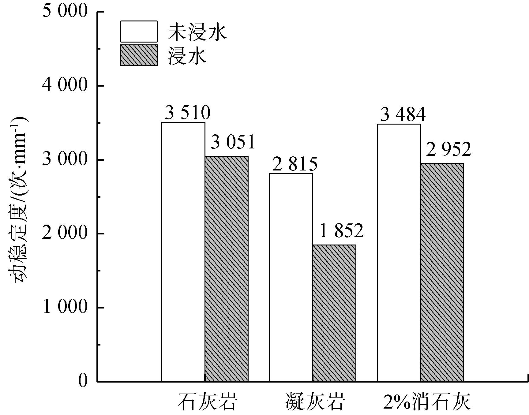 由图6可知,无论是浸水前还是浸水后,无外加剂凝灰岩试样动稳定度值均为最小,浸水前凝灰岩试样动稳定度值为石灰岩试样的81.2%,而浸水后该值只达到石灰岩试样的60.7%,说明凝灰岩混合料在水环境作用下抗车辙能力较差;掺2%消石灰后的凝灰岩混合料动稳定度值得到明显提升,未浸水时其动稳定度值为3 484 次/mm, 达到石灰岩混合料的近99.3%,浸水后其动稳定度值为2 952 次/mm, 可达到石灰岩混合料的96.8%,浸水前后与石灰岩混合料动稳定度比值只下降了2.5%,这是由于消石灰中碱性成分与沥青中酸性物质进行反应,提高了凝灰岩集料与沥青之间黏附性,从而增强了凝灰岩混合料抵抗水损害能力,其在水环境下的高温性能得到提升。