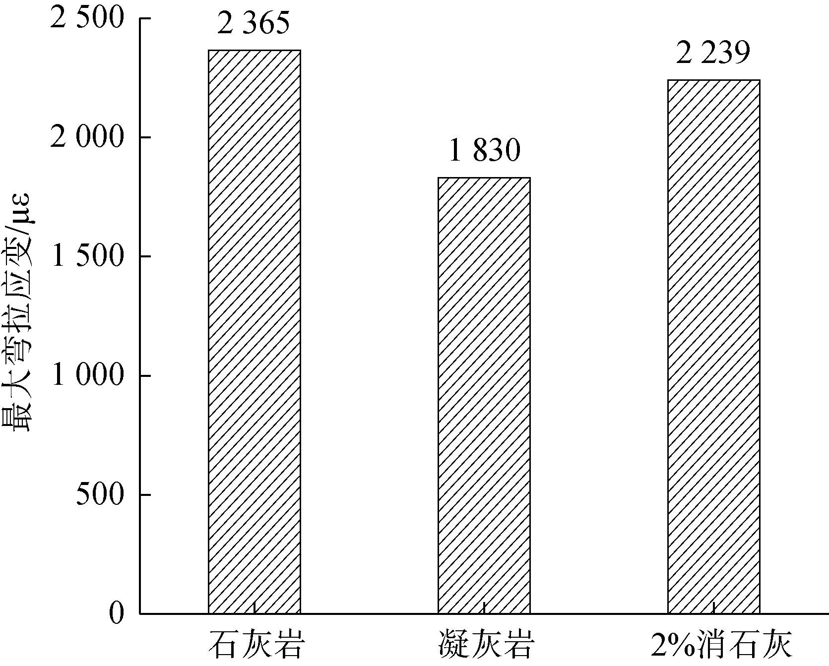 由图7可知,无外加剂凝灰岩混合料最大弯拉应变值最小,只达到石灰岩试样77.4%,说明相较于石灰岩混合料,凝灰岩混合料低温抗裂能力较弱;但在掺2%消石灰后,凝灰岩混合料最大弯拉应变值得到提升,并接近石灰岩试样试验结果,如掺2%消石灰试样最大弯拉应变为2 239 MPa, 达到了石灰岩试样94.7%,与未掺外加剂凝灰岩试样相比提高了22.4%,并满足规范要求。说明消石灰在沥青中起到了一定的增韧增塑作用,从而显著提高凝灰岩混合料的低温性能。