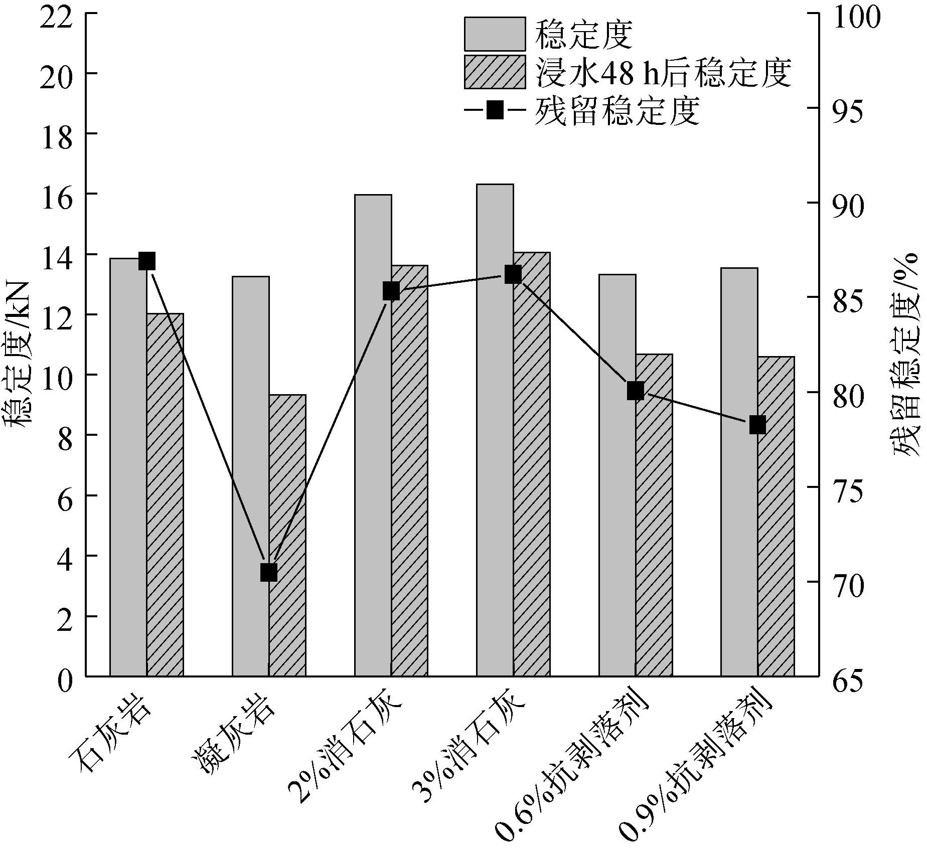 (2)相比不掺外加剂的凝灰岩混合料,掺2%消石灰后试样残留稳定度和冻融劈裂比提高了21%和13.5%,掺0.6%抗剥落剂后相应指标提高了13.6%和9.5%;长期老化试验表明,掺抗剥落剂凝灰岩混合料易受老化影响,改善效果不及消石灰显著。