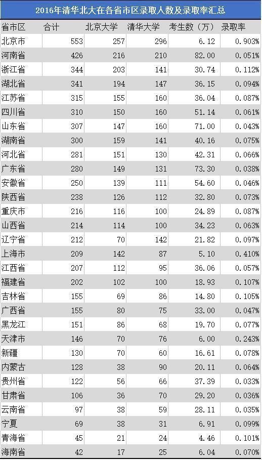从2016年清华、北大在各省的录取率来看,录取率最高的北京市、上海市和天津市分别是0.903%、0.410%和0.243%。录取率超过0.1%的省份,也仅有浙江省、福建省、吉林省和青海省。