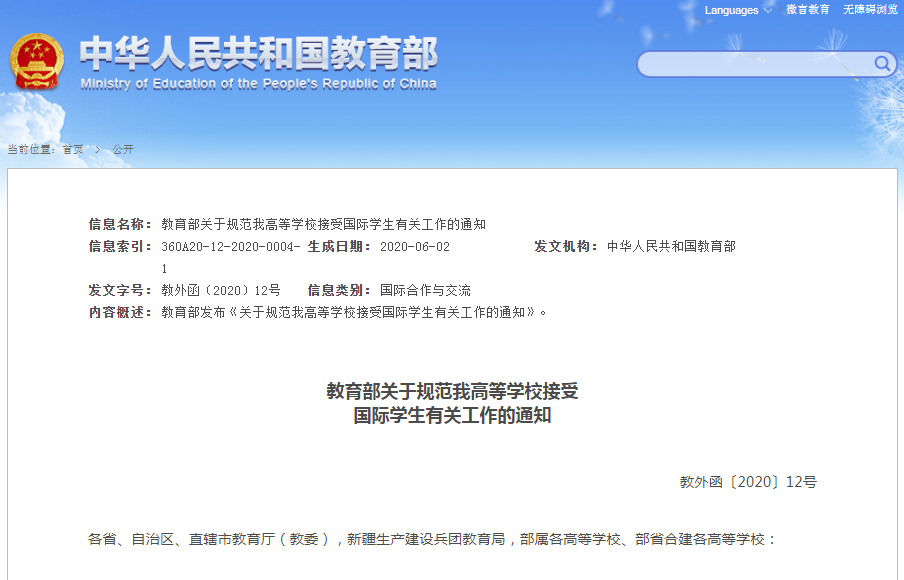 2020年6月10日,教育部公布修订后的《关于规范我高等学校接受国际学生有关工作的通知》。