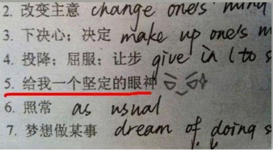 就好像这个汉译英的题目,原本是让学生翻译“给我一个坚定的眼神”这个短语,可能是学生不会,于是就真的给老师画了一个坚定的眼神,不得不说这神情确实够坚定,但是老师可不会给分的哦!